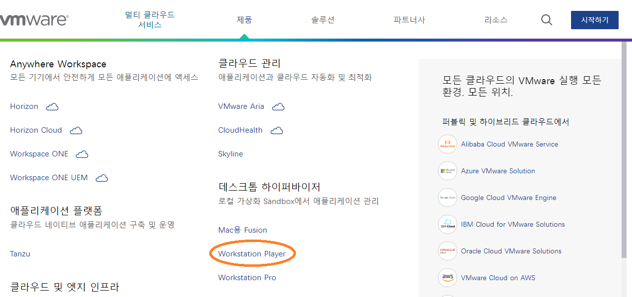 1. 아래의 링크에서 제품 >> Workstation Player 클릭해 줍니다.