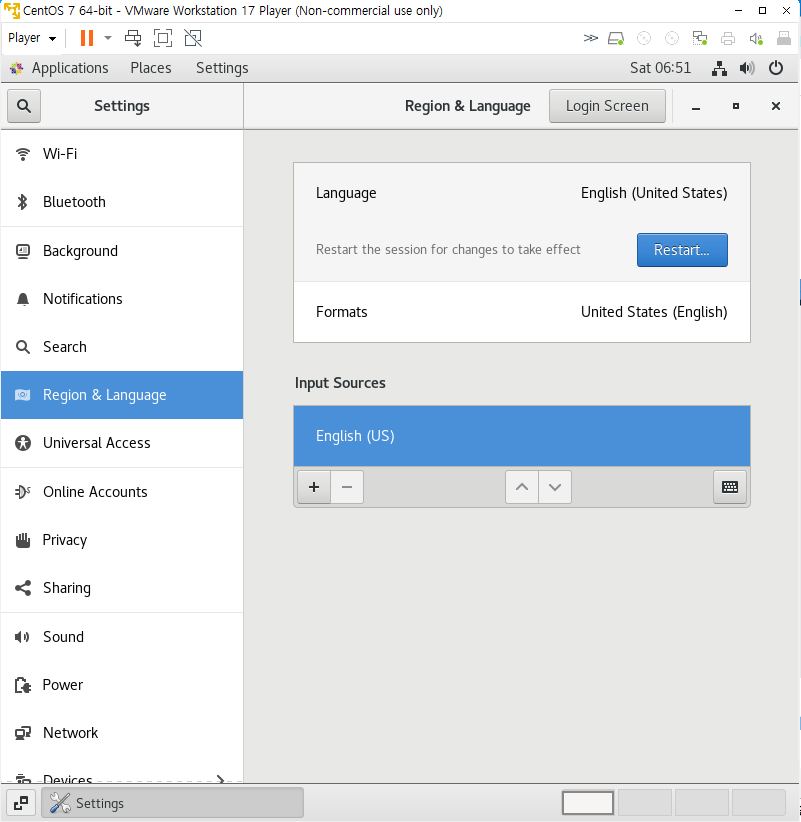 좌측 상단에 player >> manage >> virtual machine settings 로 들어가 기본 언어를 한국어로 바꾸어 줍시다.
